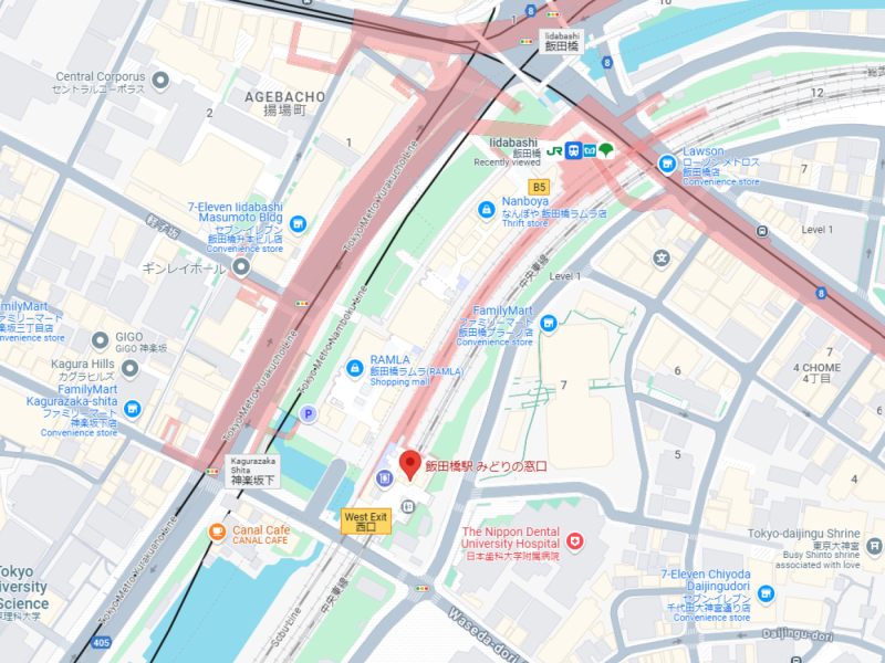 15:30 : Meeting with the guide outside the West Exit ticket gate of JR Iidabashi Station. There is only one ticket gate at the West Exit.
